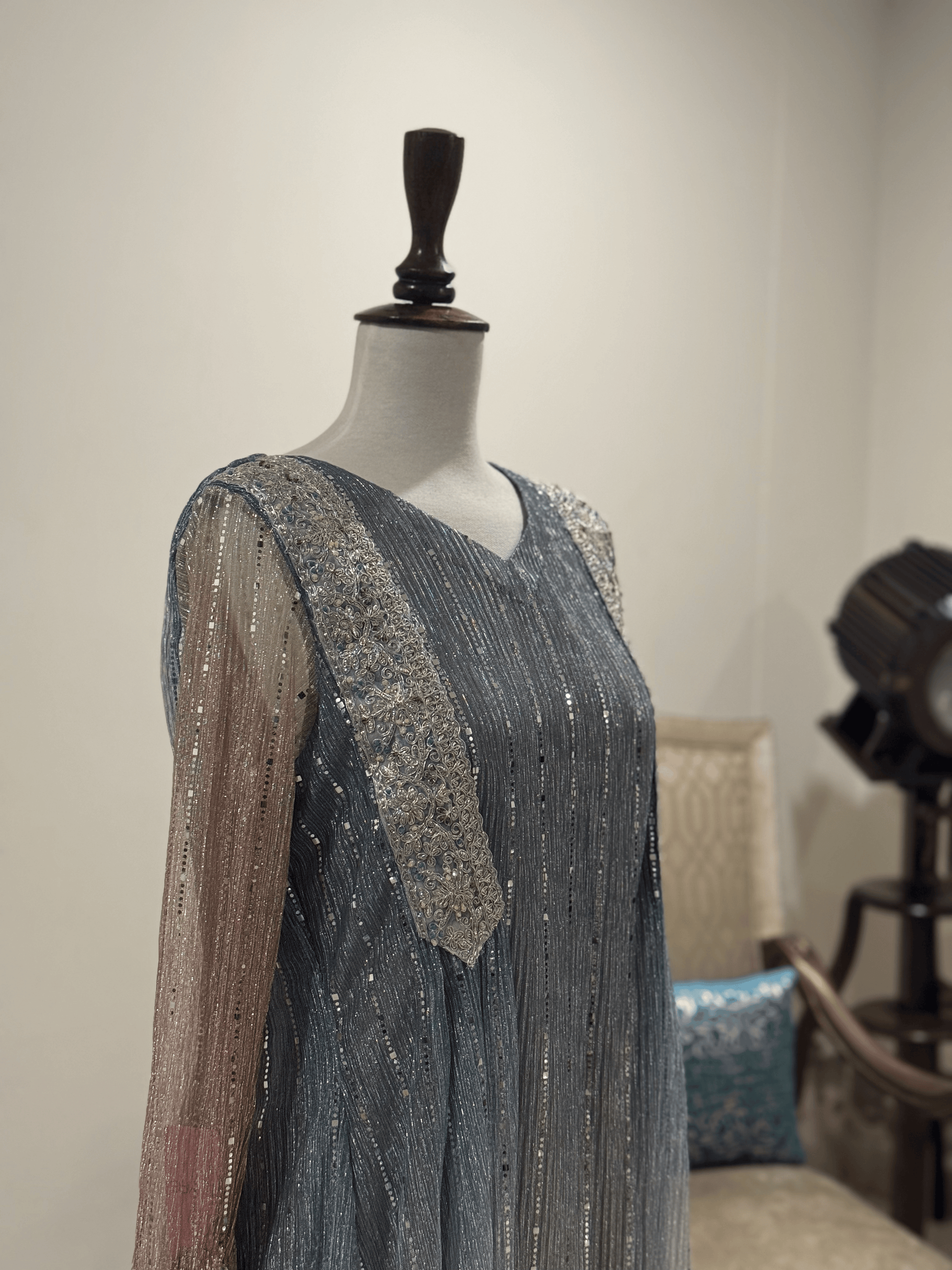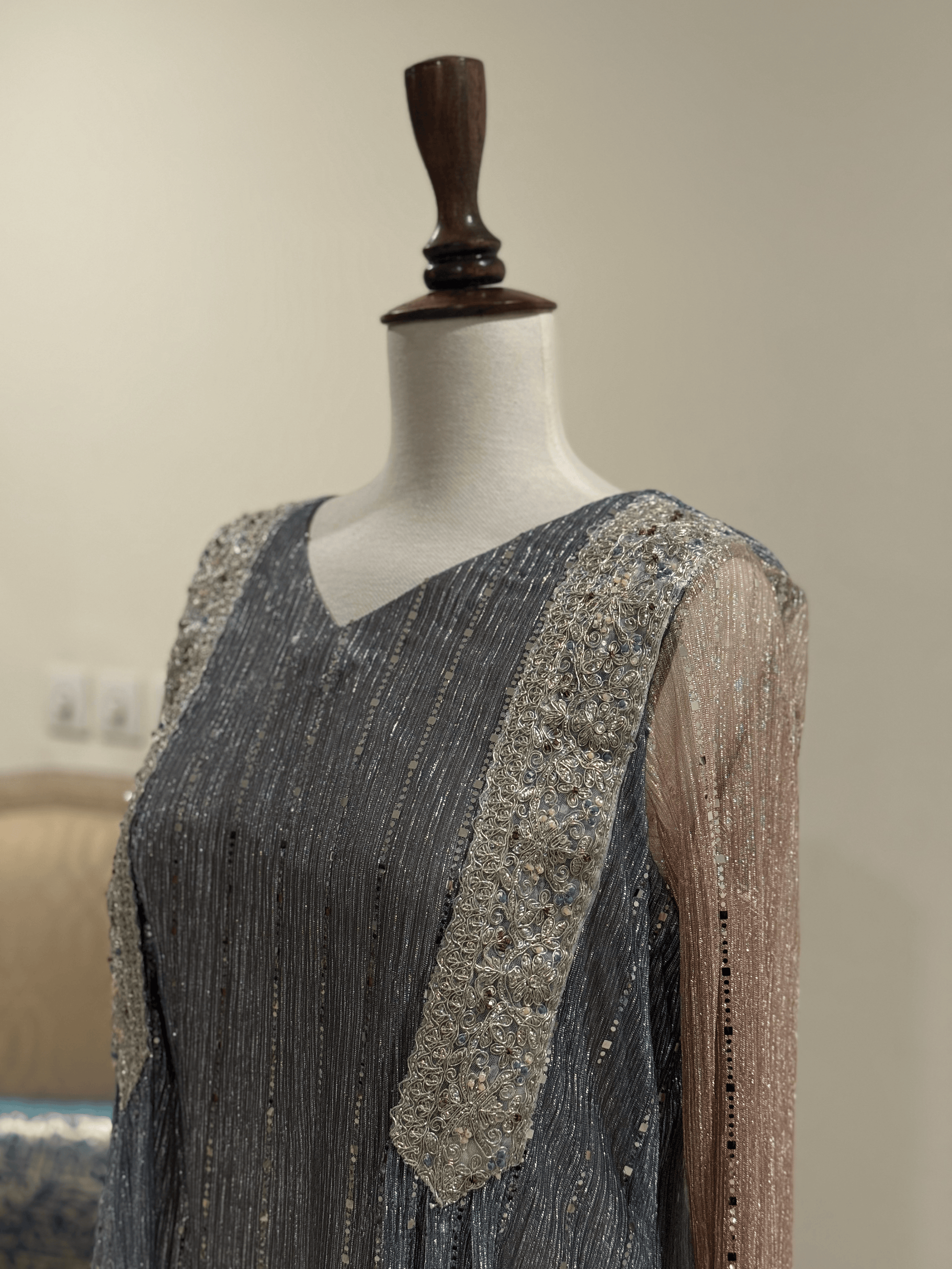 – A graceful flowy silhouette crafted in soft fabric, blending dreamy shades that reflect the elegance of moonlight. Designed with a refined finish and subtle detailing, this maxi radiates sophistication, making it perfect for evening wear and special occasions.