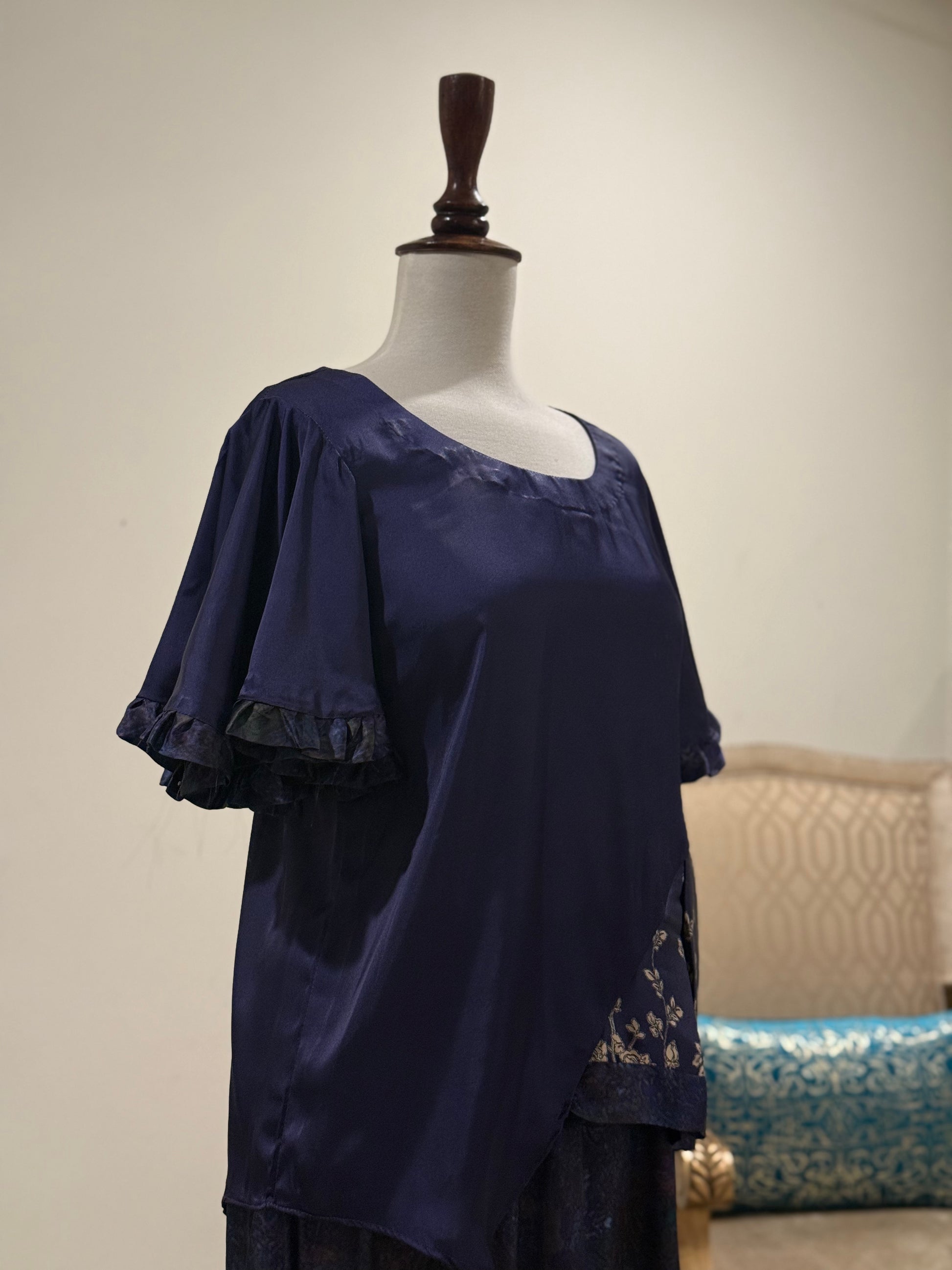 A graceful luxurious silk, featuring a rich purple hue that exudes timeless charm. The flowing silk skirt pairs effortlessly with a perfectly tailored blouse, creating a refined look ideal for festive occasions