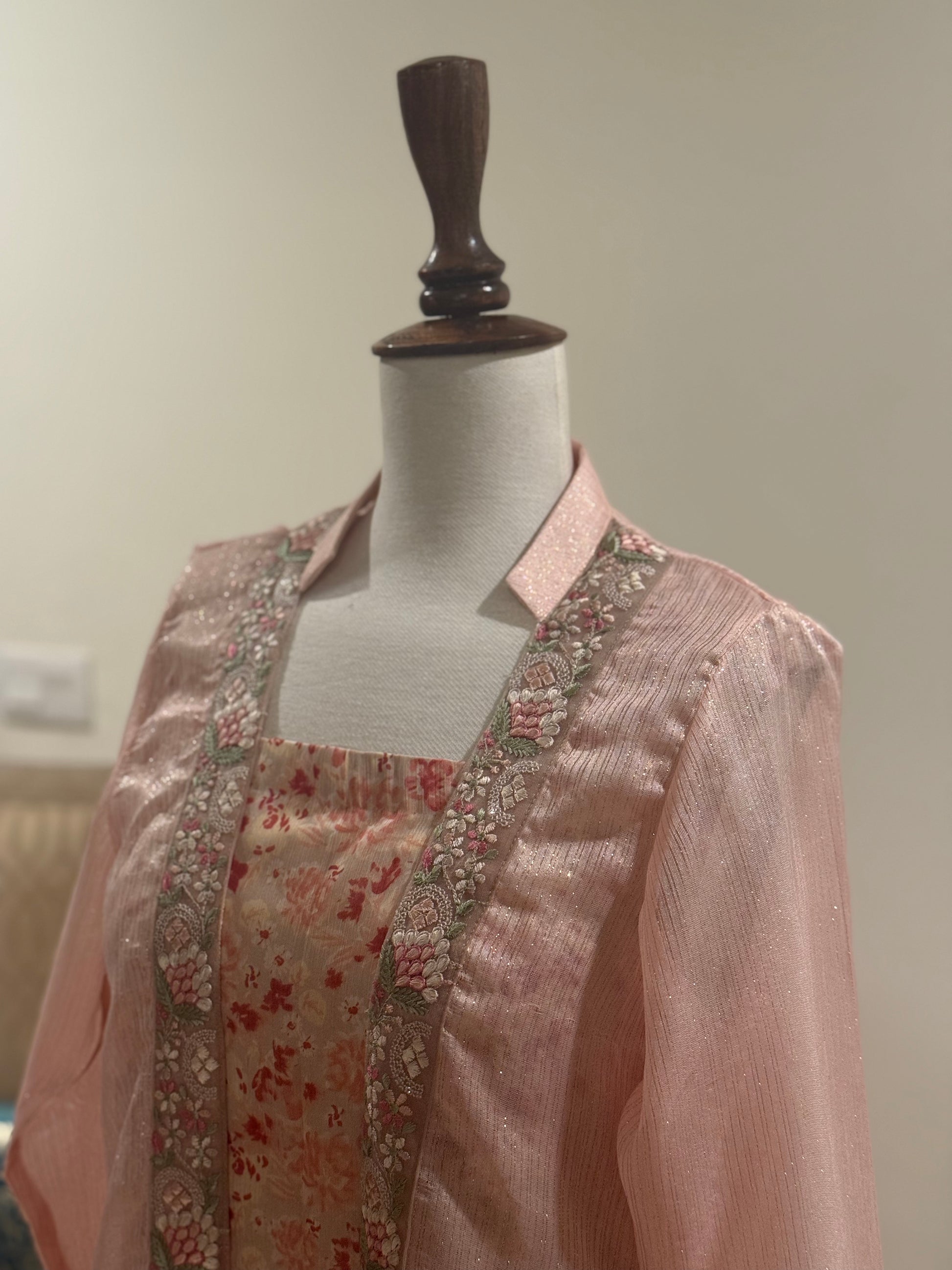 Elegant printed chiffon maxi paired with a delicate zari chiffon gown, blending airy grace with subtle festive shimmer.”