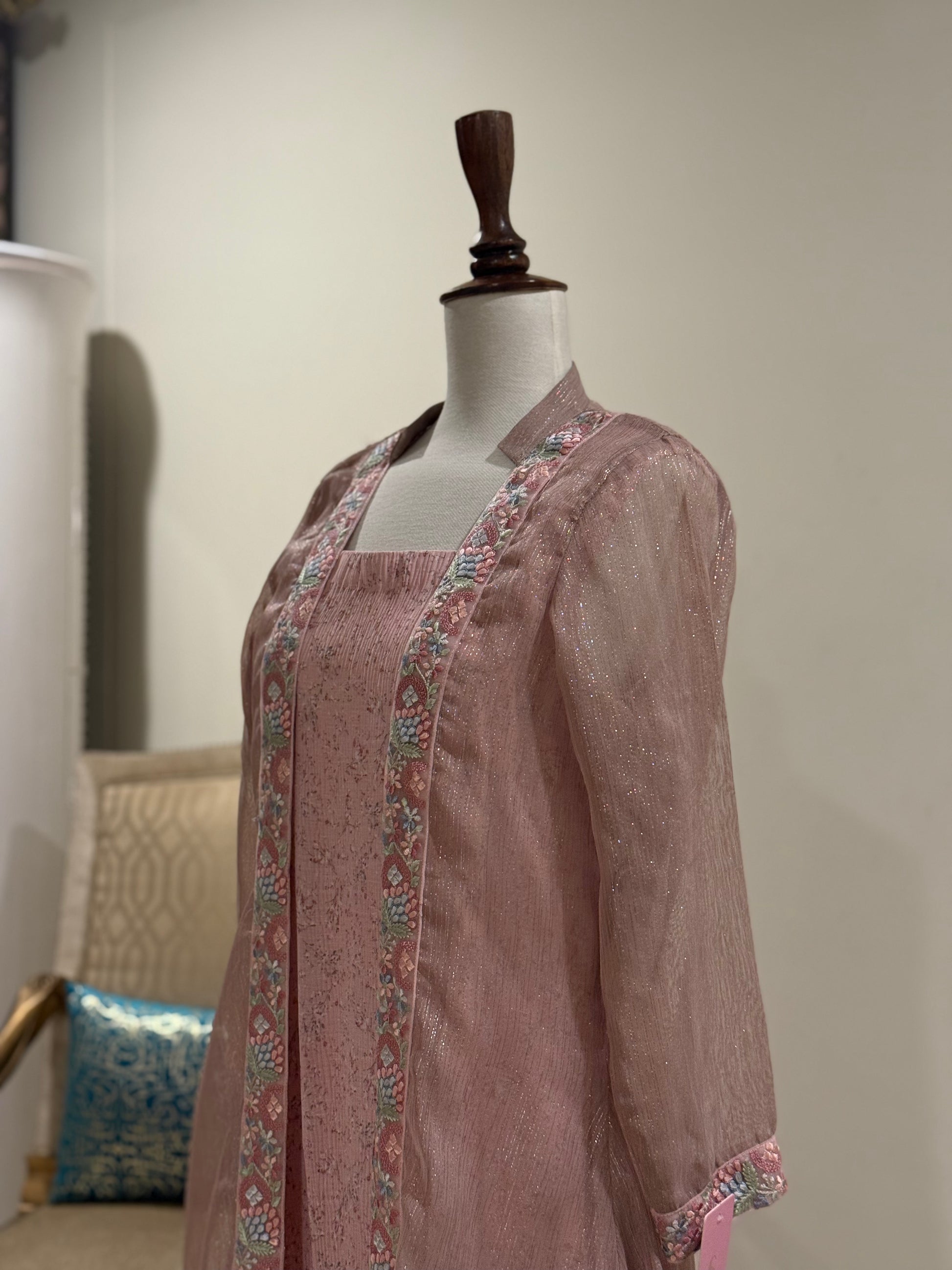 Elegant printed chiffon maxi paired with a delicate zari chiffon gown, blending airy grace with subtle festive shimmer.”