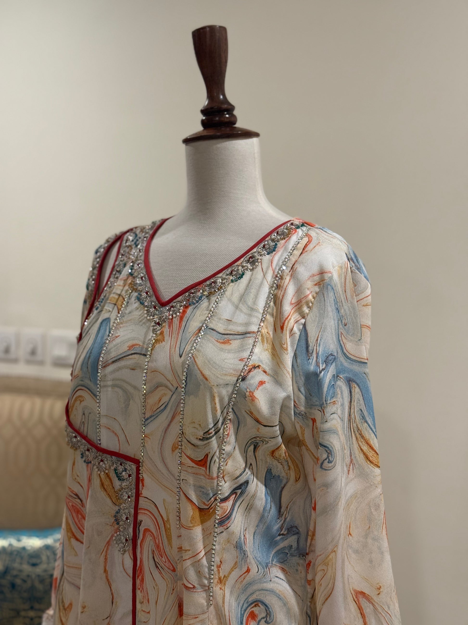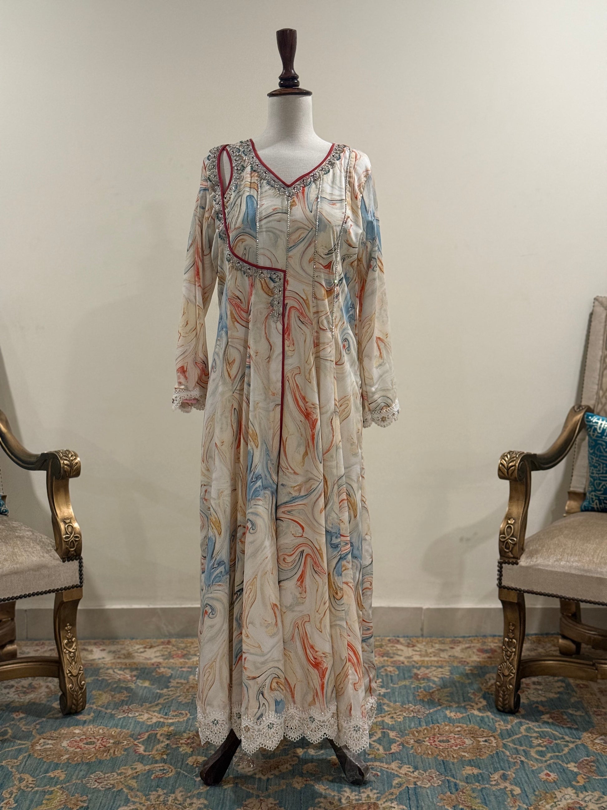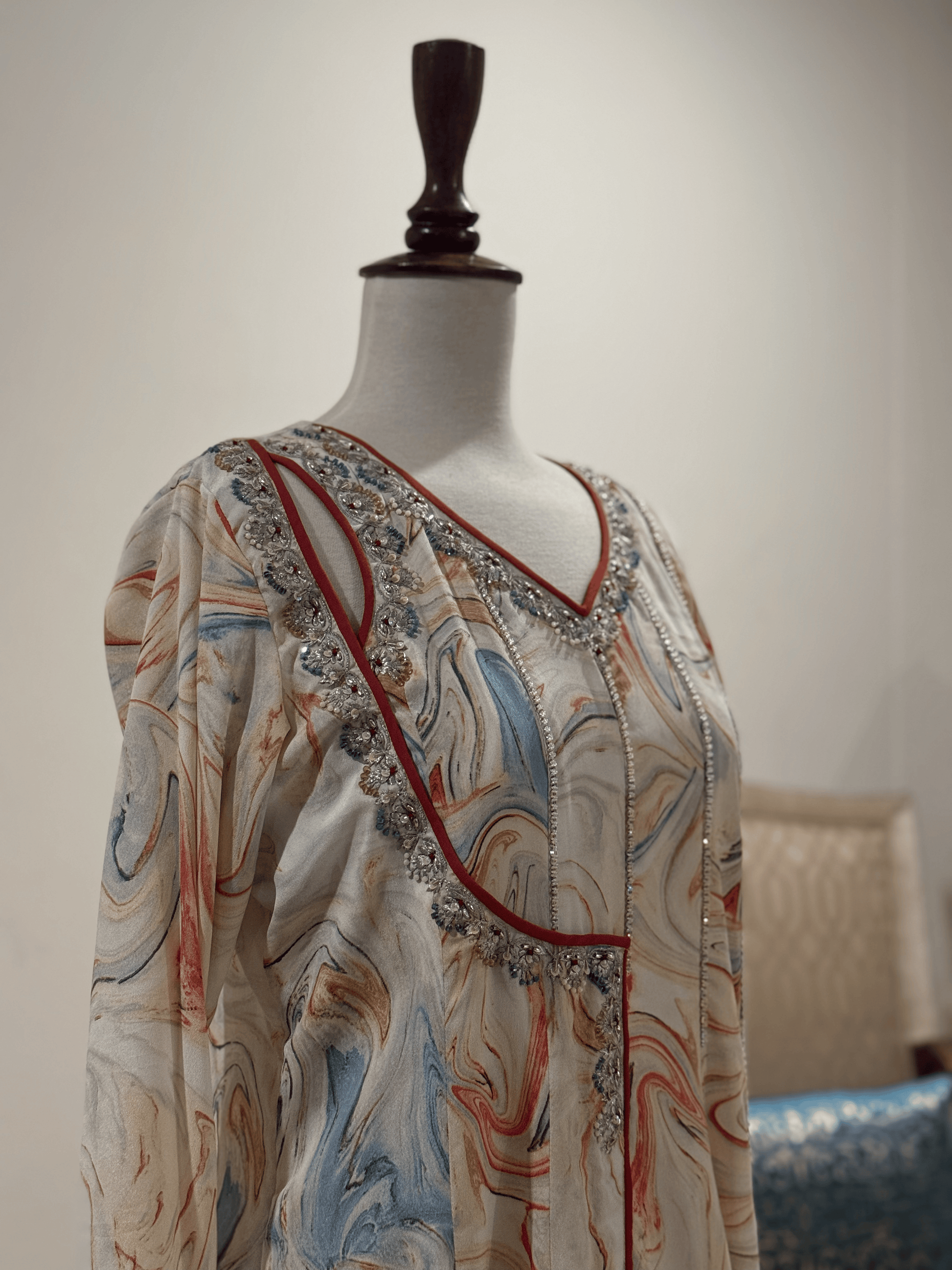 Multi Angrakha Grip Frock – A graceful blend of tradition and modernity, crafted in a flattering angrakha style.The intricate hand embellishments add a touch of luxury, making it perfect for festive gatherings,